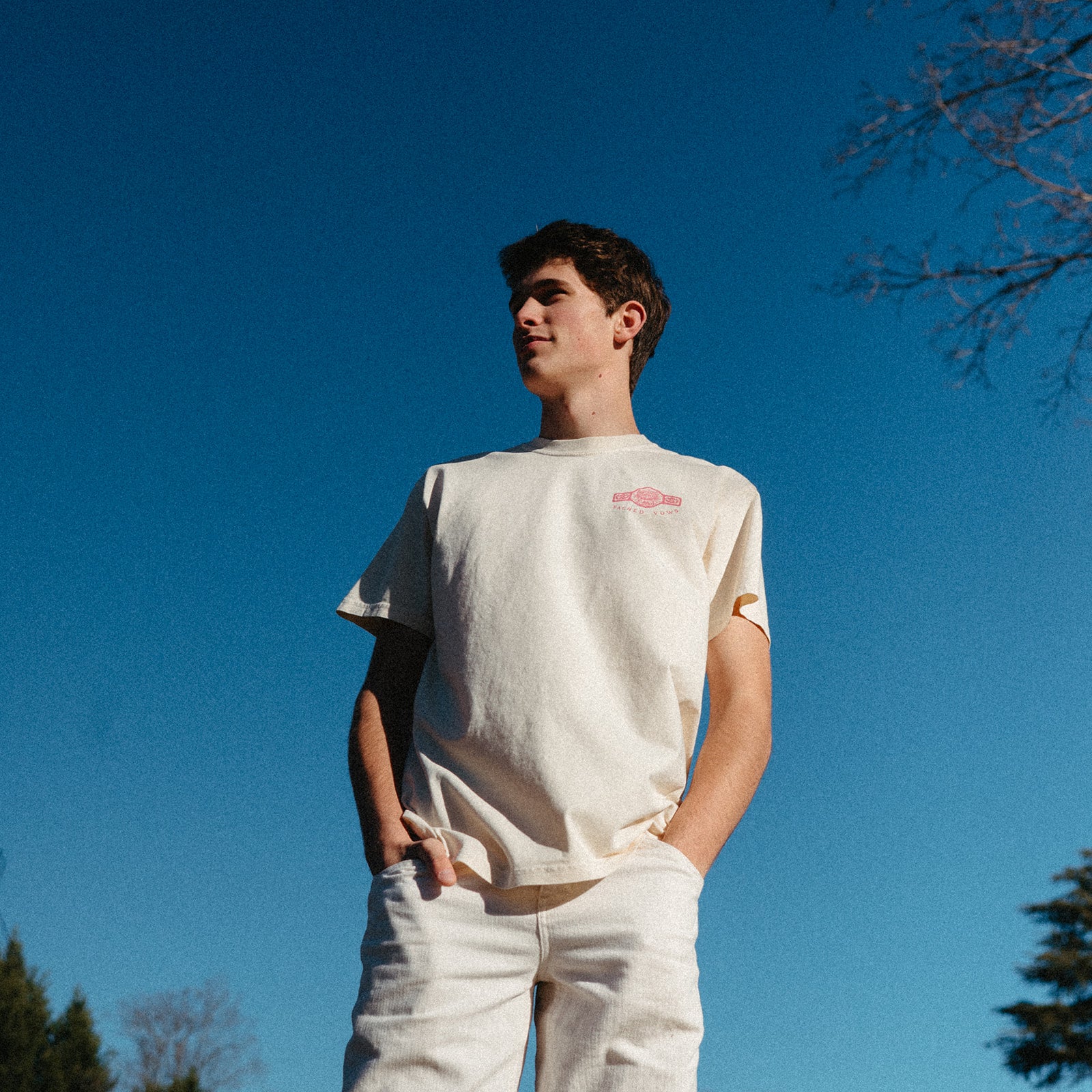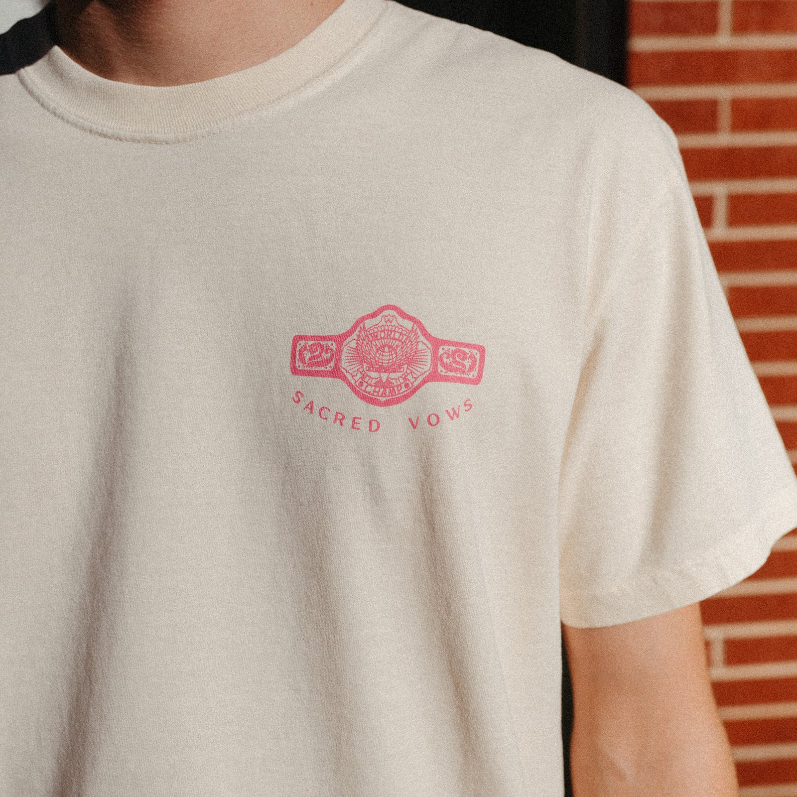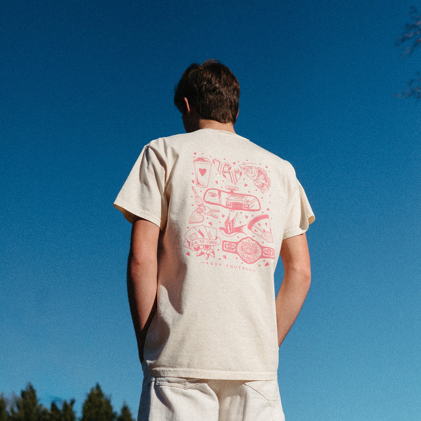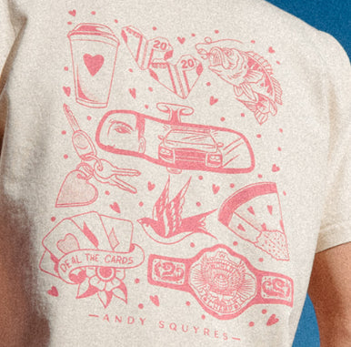 Andy Squyres' new music deserves a new drip drop and boy do we have one for you! The brand new Sacred Vows t-shirt is designed by artist Cory Romeiser and based on the lyrics to Andy's new ep Sacred Vows, these ivory colored 100% cotton, premium tees are covered on the back with a large graphic a large mouth bass, two heart shaped twenty dollar bills, playing cards, cops in the rear view mirror, truck stop coffee, and a slice of watermelon "covered in Tajin" all in American Traditional Tattoo design printed in pink ink. There is a small heavyweight champion on the front left chest with "Sacred Vows" beneath it.