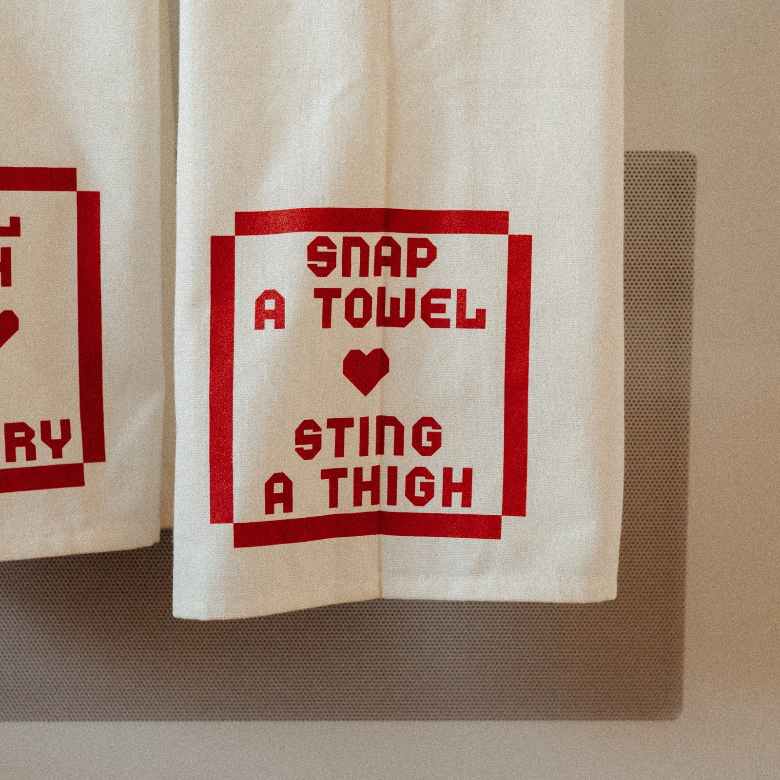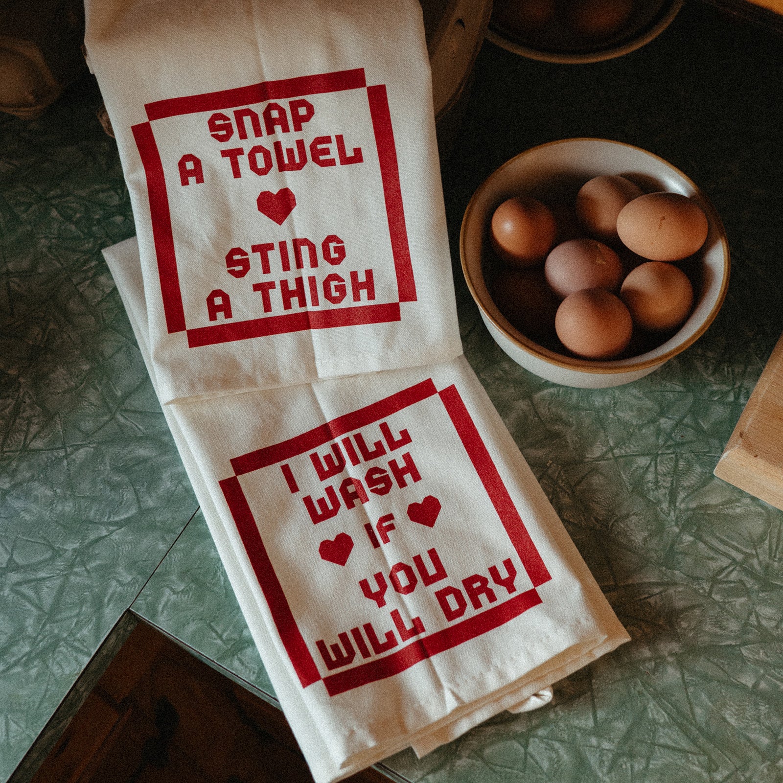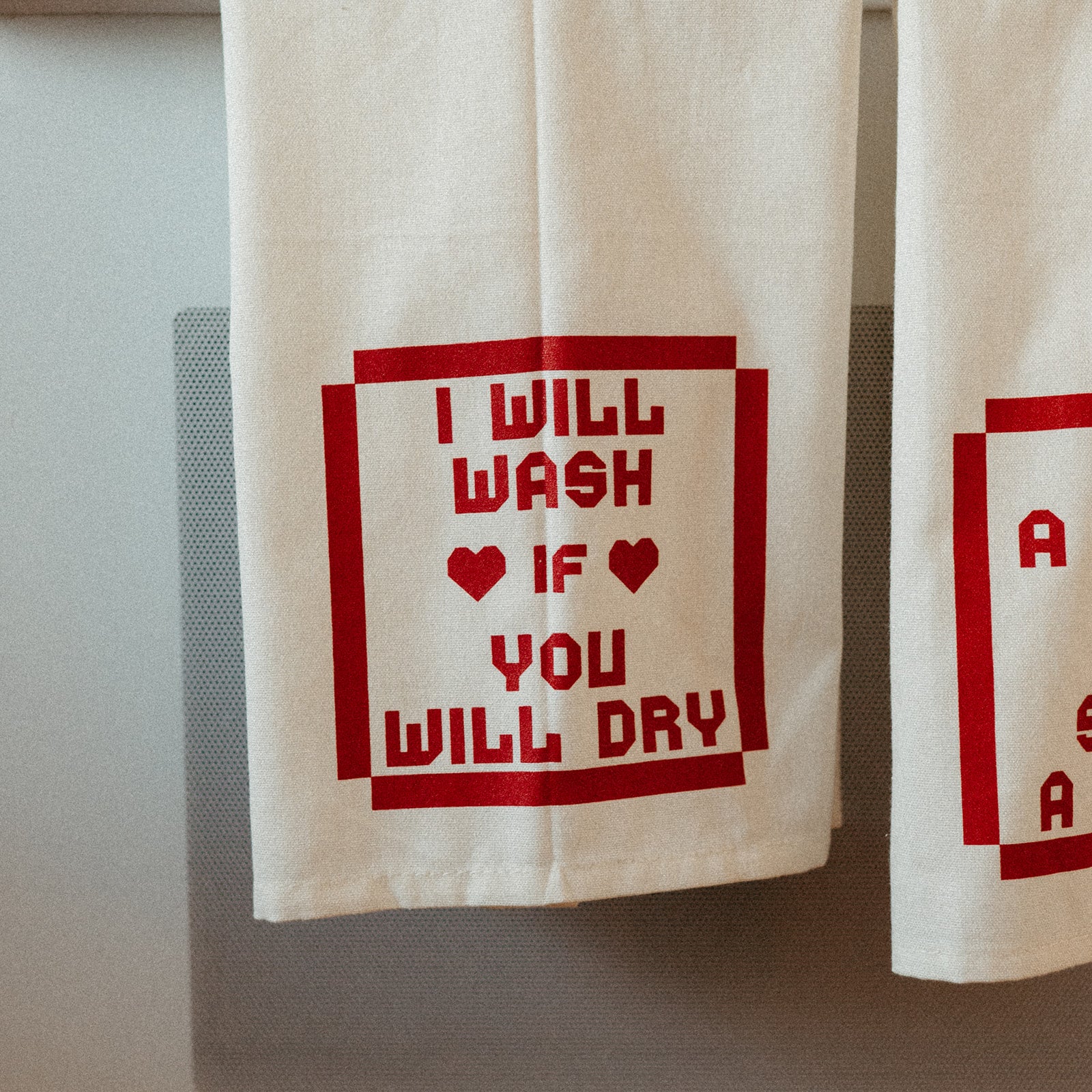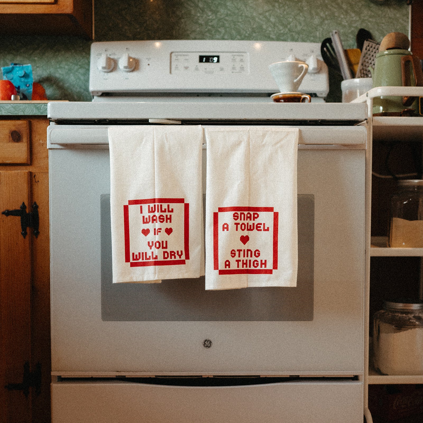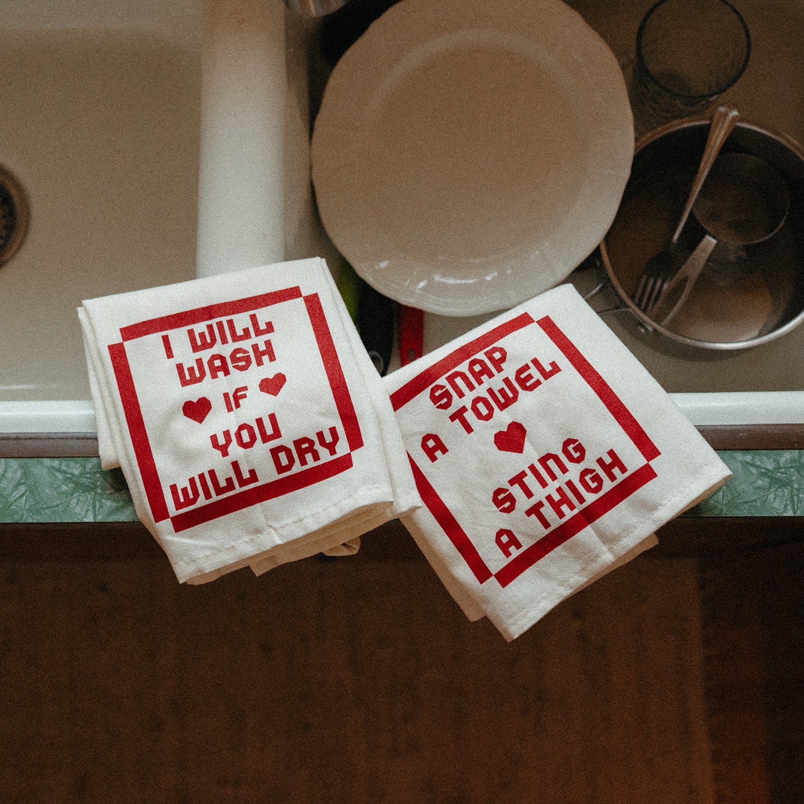 Based on lyrics from Andy's song Dancing In The Kitchen, this beautiful dish towel set comes with two separate towels. The first says "I Will Wash If You Will Dry" and the second says "Snap A Towel Sting A Thigh" printed in a cottage core font in candy apple red ink.